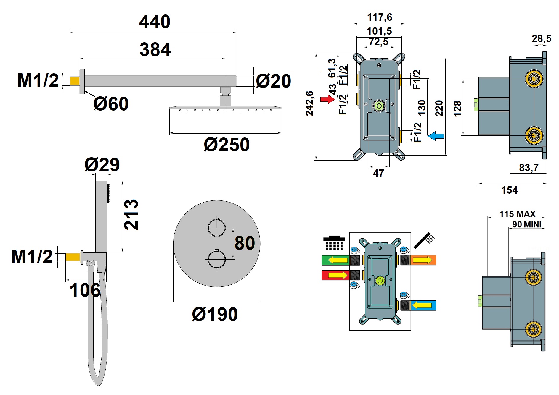 Profondeur d’encastrement : 90 mm - 115 mm | Saillie : 384 mm