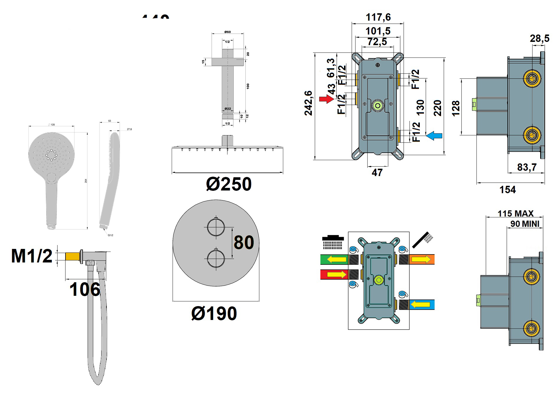 Pomme de tête : Métal Ø 250 mm | Douchette ABS : 3 jets